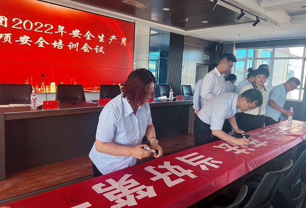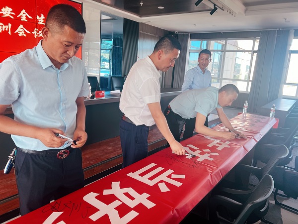 會后集團全體員工在安全生產(chǎn)月主題橫幅上簽字,承諾要切實把安全生產(chǎn)責(zé)任扛在肩上、扎在根上、落在實處,堅守全員都是安全生產(chǎn)的領(lǐng)航兵,切實做好安全領(lǐng)域的各項防范和管理工作。