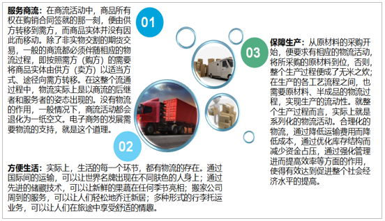 關(guān)于物流的作用,概要的說,包括服務(wù)商流、保障生產(chǎn)和方便生活三個(gè)方面。